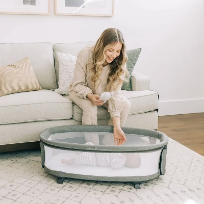 Sleep soundly knowing that your baby is secure and comfortable in the Baby Delight® Beside Me™ Nova Bassinet with Stand. This tool-free assembly, 2-in-1 design can be used in the sturdy base or the bassinet can be easily removed for portability in any room, making it ideal for napping as well as overnight sleeping. Breathable mesh walls create a safe visible space for your baby to sleep comfortably. Our conveniently attached, extra-large storage basket offers plenty of space for all your baby’s essentials. We understand that babies can make quite the mess, therefore we have designed an easily removable and washable cover and sheet making clean up a breeze.