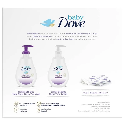 - Includes: Baby Dove Calming Nights Tip to Toe Wash (13oz), Baby Dove Calming Nights Night Time Lotion (13oz) and a Muslin Swaddle Blanket.
