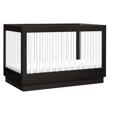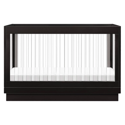 - MODERN CLEAR VIEW DESIGN The chic Harlow crib offers you an unobstructed view of babe with unique acrylic slats on a contrasting solid wood platform.