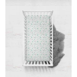 - This Bacati 10-piece Crib Set Includes Reversible Comforter/Playmat (33 x 43 inches), Crib fitted sheet (52 x 28 x 6 inches), Crib Skirt/Dust ruffle (13 inch drop) Diaper Stacker (holds more than 30 newborn diapers), Reversible Long Crib Rail Guard Cover (52 x 12 inches), Window Valance (15 h x 56 w inches with 1.75 inch Rod Pocket), 3 pc Wall Hangings Set and Musical Mobile in fun, colorful and signature prints in 100 percent cotton 200 Thread Count percale fabrics. Designed in United States by Experienced Designers. Many coordinating items available to purchase separately in this Bacati Elephants Aqua/Lime/Gray Bedding Collection.