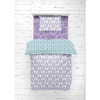 - This Bacati 4-piece Toddler Bedding Set Set Includes Reversible Oversize Comforter (42 x 55 inches), Toddler Bed Fitted Sheet(52 x 28 x 6 inches), Toddler Bed Flat Sheet(52 x 42 inches) which is fitted at the bottom to make the bed easily and Standard Pillow Case (20 x 25 inches) with french ties on the back in fun, colorful and signature prints in 100 percent cotton 200 Thread Count percale fabrics. Designed in United States by Experienced Designers. Many coordinating items available to purchase separately in this Bacati Paisley Isabella Purple Lilac Aqua Bedding Collection.