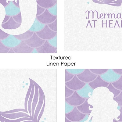 Let’s Be Mermaids Artisms INCLUDES: Set of 4 linen paper wall art prints. Each print SIZE 8 inches x 10 inches. These 4 unframed prints are perfect home decor for Child’s nursery, playroom, bathroom or bedroom. WALL ART SET: Lavender and teal unframed prints are a coordinating set of 4 prints that will give your wall a pulled together look. This set is printed for vertical wall art display. Choose to display as gallery wall set or use each print to style 4 individual moments throughout your home. HOME DECOR: Give your home a contemporary room update with Let’s Be Mermaids art prints. This set of 4 Child’s nursery, playroom, bathroom or bedroom design prints feature Mermaids in silhouette, “Mermaid at Heart”, and “Mermaids Make Waves”. HIGH-QUALITY ART PRINTS: Let’s Be Mermaids vertical wall art prints are professionally printed one-sided on textured linen paper. Linen paper gives these prints a fine finish. Set of 4 wall art prints will come unframed, giving you the creative direction to display how you like. Each linen paper print measures 8 inches x 10 inches. MADE IN THE USA: Let’s Be Mermaids linen paper wall art set is designed and manufactured at our Wisconsin facility using materials that are Made in the USA.