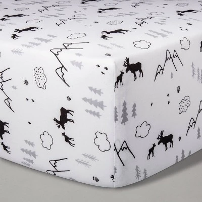 Fitted 100% Cotton Crib Sheet fits standard crib mattress 28 in x 52 in with 8-inch deep pockets and is fully elasticized for a secure fit. Sheet features a moose and mountain scatter print