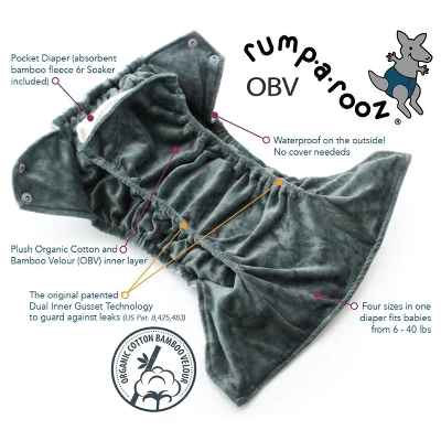 The Rumparooz OBV One Size Cloth Diaper is here to bring you the best features of the two top Kanga Care products: the Rumparooz One Size Cloth Diaper and the Ecoposh OBV One Size Fitted Cloth Diaper. The Rumparooz OBV brings to you the premium plush Organic Cotton viscose of Bamboo Velour inner lining of the Ecoposh OBV along with the rayon from Bamboo 6r Soaker. These features have been combined with the waterproof TPU (thermoplastic polyurethane) outer cover and adjustability of the Rumparooz One Size Pocket Diaper design to give you a bullet proof diaper that will grow with your child. From birth to potty training the Rumparooz OBV offers premium organic materials and max absorbency. Let’s not forget the patented leak protection technology of the double inner gussets to keep the messiest of messes locked in. The diaper is the perfect solution for daytime, nighttime, heavy wetters, cloth diapering parents or anyone who is looking for award winning cloth diapering options for their little one.
