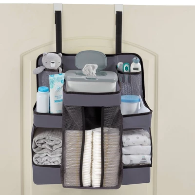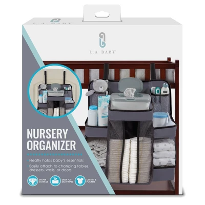 The nursery organizer neatly stores baby’s essentials where you need them most. Attach it to your changing table, dresser, wall or hang from the back of a door. Convenient pockets and shelves provide easy access to diapers, wipes, lotions, creams, and toys. This space saver all-in-one organizer will make the most of unused vertical space and keep all your changing needs and your baby’s changing essentials in one place. Easy to install virtually anywhere with its universal attachment options.