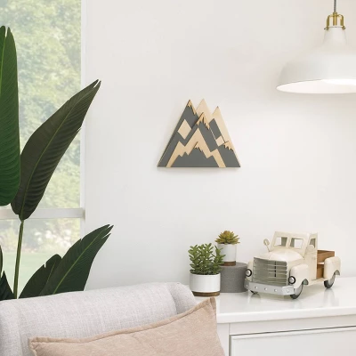 This Natural Wood 3D Mountain Wall Décor is sure to add fun to any nursery! This layered wood wall décor features two metal hooks on the back for easy hanging! Features gray mountains with snow caps for a realistic look! Measures 9.5″ x 12″. Dust with a soft, dry cloth.
