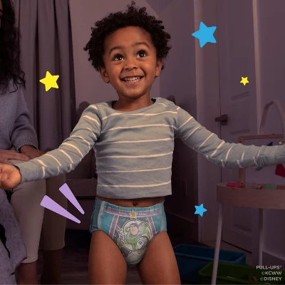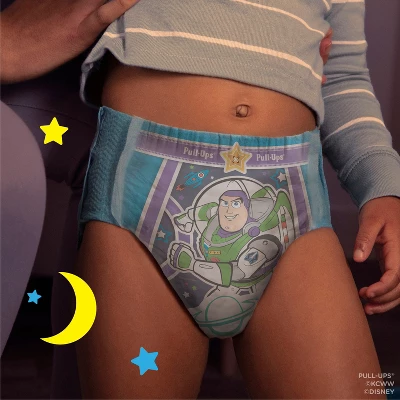 Nighttime potty training is made easy with Pull-Ups Night-Time Potty Training Pants, the only disposable training underwear designed specifically for nighttime! These training underwear absorb more than diapers* and offer up to 12 hours of overnight protection for your toddler. They are made with soft and breathable materials, so your child can stay comfortable as they sleep. With refastenable, easy-open sides, you can keep clothing on your child and have quick changes in the middle of the night. The soft, stretchy sides provide an underwear-like fit and slide up and down to promote Big Kid independence. Pull-Ups Boys’ Night-Time Potty Training Pants feature Disney·Pixar designs of Buzz Lightyear from Toy Story, with graphics that fade when wet to help your little one learn and celebrate dry nights. No matter where your child is in his potty training journey, the Pull-Ups brand can help. Visit the Pull-Ups website for expert articles, tips and potty training resources. We’ve helped train 60 million Big Kids and counting! Pull-Ups Night-Time Boys’ Training Pants are available in sizes 2T-3T (16-34 lbs) and 3T-4T (32-40 lbs). (*vs. size 3-5 Huggies Little Movers diapers)